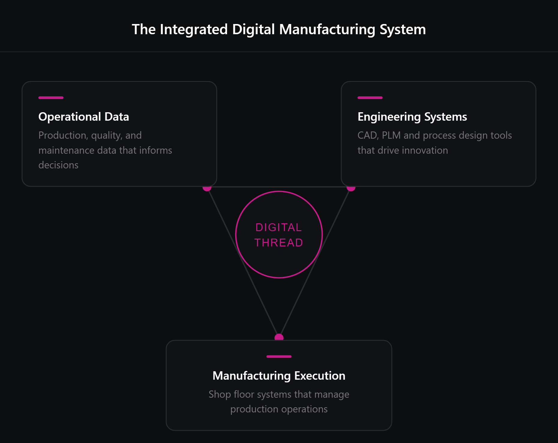At its core, digital manufacturing connects three domains that have historically operated with limited integration: engineering definitions, operational execution, and production data. When these elements operate within a shared digital environment, manufacturing organizations gain the ability to understand and improve production performance with far greater precision.