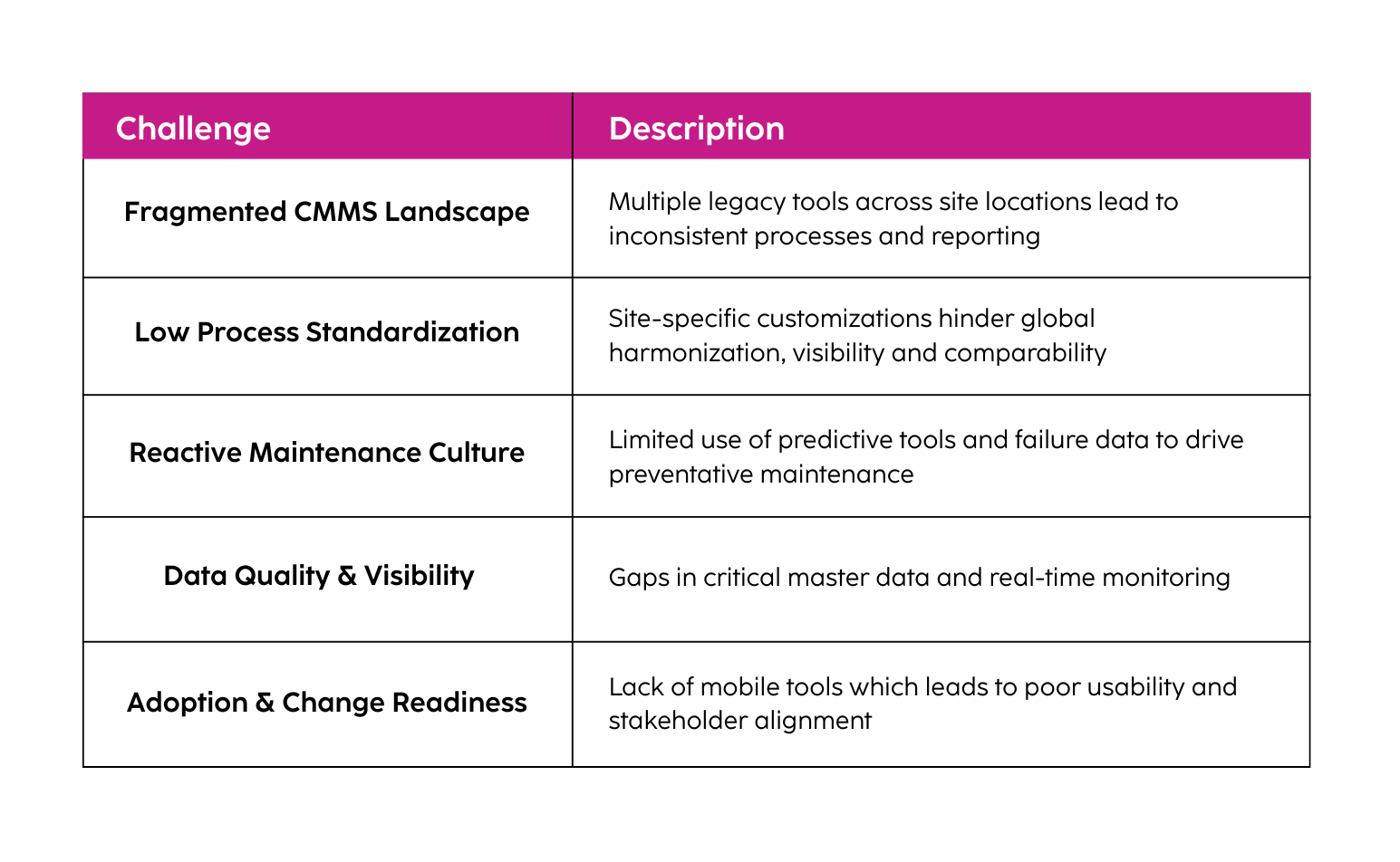 Challenge - Fragmented maintenance systems, limited use of SAP PM and inconsistent practices