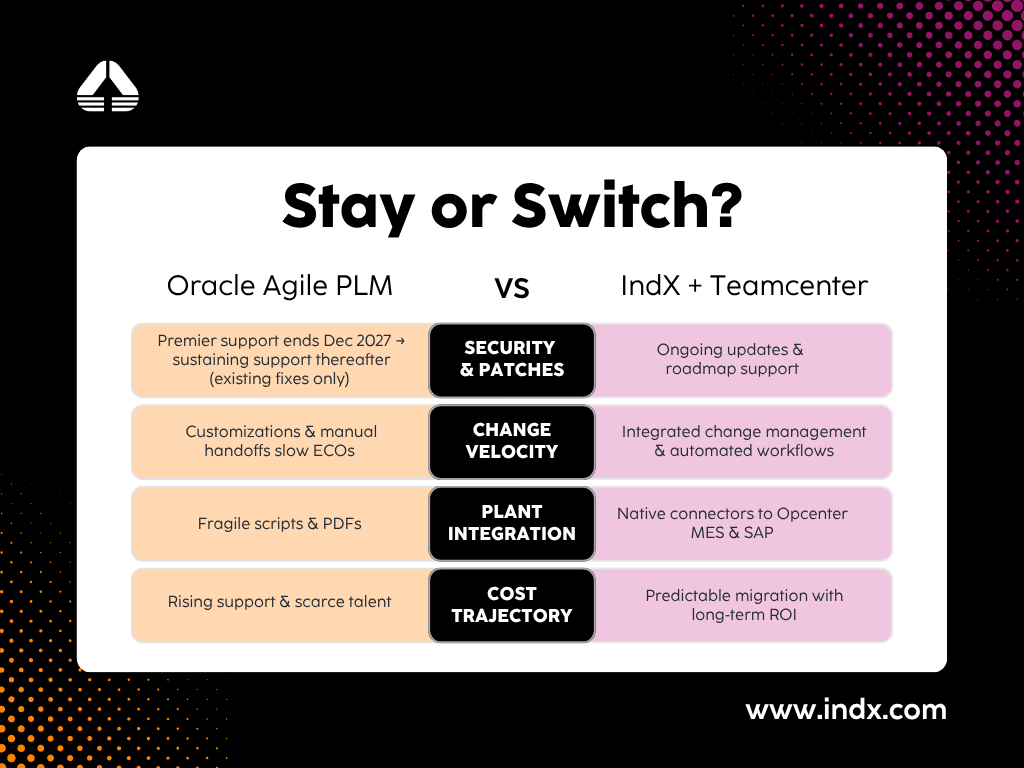 When Oracle Agile PLM ends support, organizations lose access to updates, security patches and validation materials. Running regulated processes on unsupported infrastructure introduces risk across: